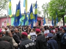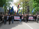 Депутаты всех уровней от ВО "Свобода" собрались возле памятника Ивану Франко на улице Независимости. В руках они держали государственные флаги с черными лентами и партийную символику, а также - транспаранты: "Долой красные тряпки!", "Долой красную символику!" "Свободовцы" кричали "Позор!" Руководству и преподавателям местных вузов, которые вместе со студентами направлялись к традиционному месту проведения митинга на 9 мая - Мемориальному кладбищу.