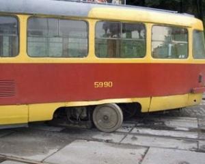 Трамвай N8, направлявшийся по маршруту "Станция метро "Позняки" - станция метро "Лесная" утром 31 мая сошел с рельсов вблизи пересечения проспекта Григоренко и улицы Ахматовой в Киеве.