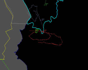 Красной линией обозначена траектория СУ-24, бирюзовой граница Турции и Сирии, а серой - движение турецкого истребителя F-16.