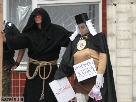 Около 14.00 под стены Броварского городского районного суда пришло около 20 активистов. Они развернули баннер с надписью: "Виталий Запорожец - наш герой", подняли флаг Украины с портретом Запорожца. На лестнице перед входом в суд поставили импровизированную виселицу и чучело судьи Тамары Михиенковой, которая вынесла Запорожцу приговор. После выступления председателя Комитета освобождения политзаключенных Николая Коханивского, его собратья попытались повесить чучело за веревку на дереве. В этот момент подбежали двое милиционеров и попытались им помешать.
