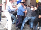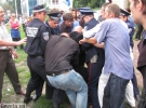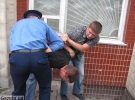 "Рука. Отпустите руку - сломаете!", - попытался вырваться от правоохранителей глава секретариата ОУН Кость Зацарный. В мирной акции он выполнял роль палача.