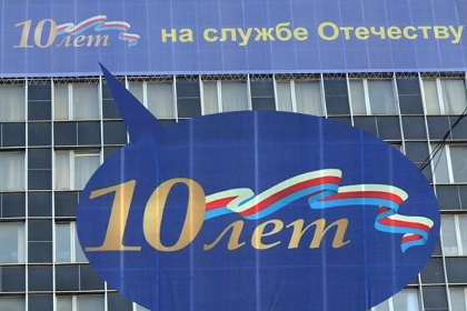На снимках видно, что авторы баннера "Десять лет на службе Отечеству" поменяли местами две полосы российского триколора. В результате красная полоса, которая должна была быть снизу, оказалась посередине, а ее место заняла синяя. Современного флага аналогичной расцветки "Ленте.ру" в справочниках найти не удалось.