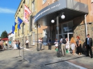 В 17.50 на площади перед входом около 40 человек. Многие местные имущих. При входе стоят двое охранников, двое девочек держат подносы с ножницами. Натянутая синяя символическая лента. На стене центра прикреплены 4 большие флаги: государственный, Черкасс, области и Евросоюза.