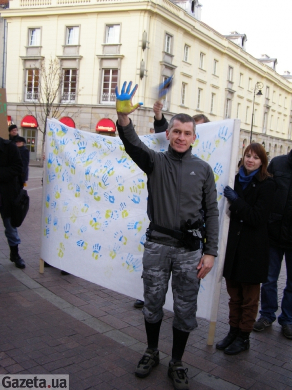 "Хотел бы выразить протест против того, что происходит сейчас в Украине, как выглядит это дело с Юлией Тимошенко", - говорит студент 3-го курса факультета журналистики и политологии Варшавского Университета Павел Яховский, который поставил сине-желтый отпечаток на полотнище.