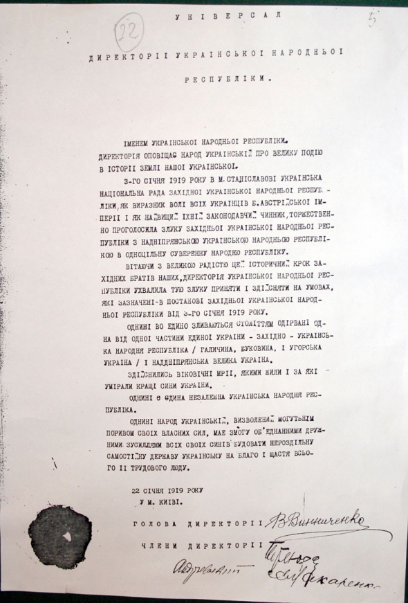 "Отныне во единственно сливаются веками оторванные одна от другой части единой Украини - Западно-Украинская Народная Республика / Галичина, Буковина, и Венгерская Украина / и Надднепрянская Большая Украина", - записано в оригинале документа.