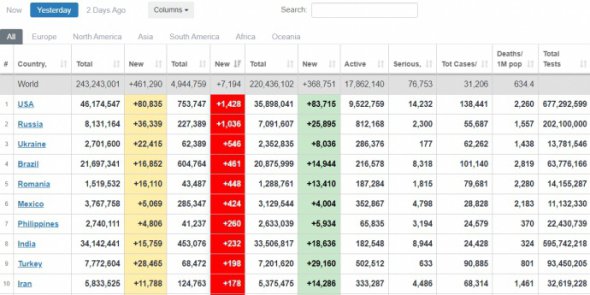 В США зафиксировали более 80 тыс. новых инфицированных за сутки, в Великобритании - свыше 52 тыс., а в России - более 36 тыс. новых заражений. Далее по количеству заболевших в рейтинге находятся Турция с более чем 28 тыс. заражений и Украина, где 20 октября зафиксировали более 22 тыс. Covid-случаев.