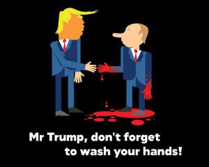 Активисты добавили к Facebook-сообщению рисунок, на котором Путин протягивает Трампу окровавленную руку с надписью на английском: "Мистер Трамп, не забудьте помыть ваши руки!".