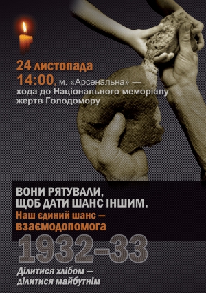 КИЇВ – 14:00 хода від станції метро Арсенальна до Національного меморіалу пам'яті жертв Голодомору 16:00 загальнонаціональна хвилина мовчання, акція "Запали свічку пам'яті"