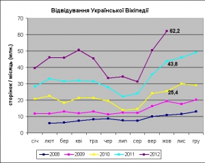 По итогам октября 2012 украинская Википедия впервые преодолела рубеж в 60 миллионов просмотренных за месяц страниц (62,2 млн.) и по темпам роста популярности стала первой в мире среди 30 самых посещаемых Википедий (+42% к октябрю 2011), опередив арабскую и китайскую.