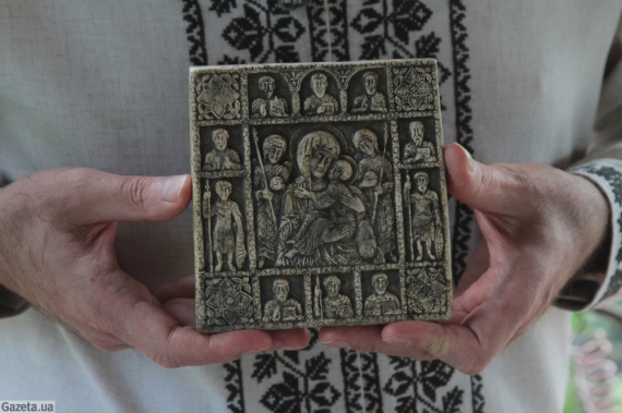 Византийская икона, выполненная в природном гипсе, на сегодняшний день является единственной в мире с подобной резьбой и композицией. Эксперты - главный хранитель фондов Национального Киево-Печерского заповедника Григорий Полюшко и ведущий специалист по византийскому искусству Василий Пуцко - настаивают на ее уникальности.
