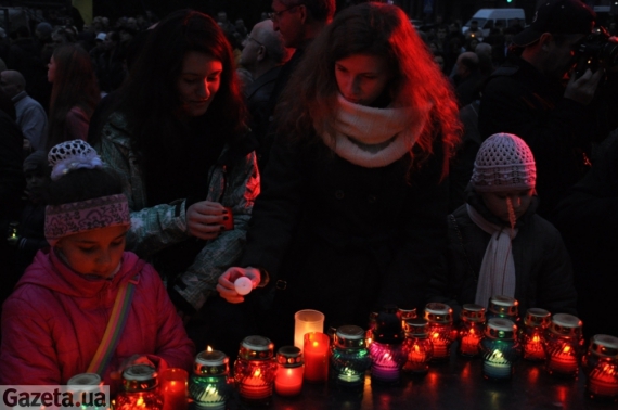 Во Львове на площади возле памятника Тарасу Шевченко около полутора тысяч человек собрались, чтобы почтить память погибших от голода. Люди держали в руках свечи, символические колоски, перевязанные траурными лентами, а также флаги Украины.