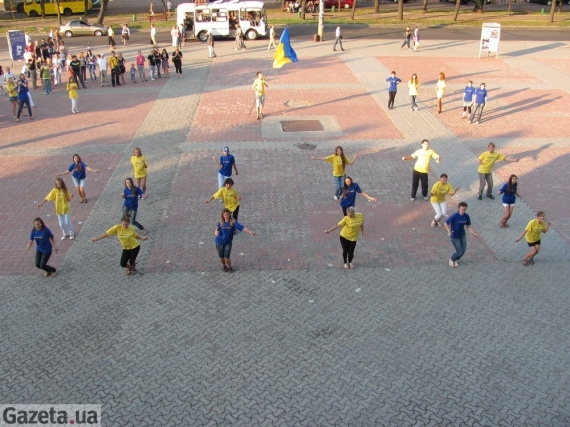В 18:30 молодежь внезапно начинает танцевать, образовывает флаг и карту Украины. Все это длится 4 минуты. Потом люди расходятся, кто-то остается.