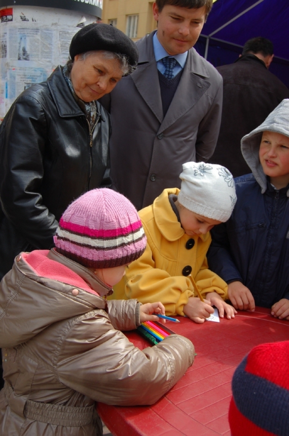 На Вечевой площади и площади Рынок стояли столики, на которых были открытки-раскраски и цветные карандаши. Депутаты приглашали детей разрисовать и подарить открытки своим мамам. Вокруг "творческого" столика собирались ребятишки разного возраста. Самому маленькому участнику акции - 2 годика, а самому старшему - 17.