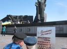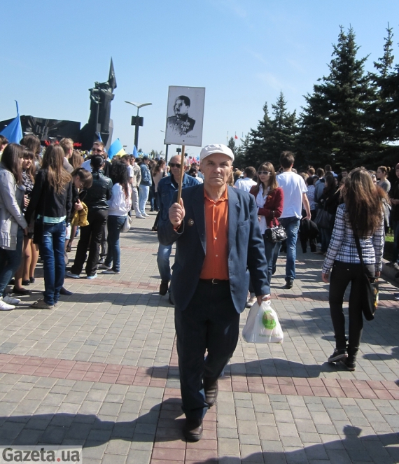 На административных зданиях 9 мая присутствуют лишь государственные флаги, но у мемориала наряду с флагом Украины поднят красный стяг. Представители различных партий пришли на праздник со своими знаменами. У многих стариков в руках была советская символика. Во время возложения цветов, как рассказали очевидцы, несколько молодых мужчин в форме воздушно-десантных войск бросили на ступени монумента флаг ОУН-УПА и прошлись по нему.