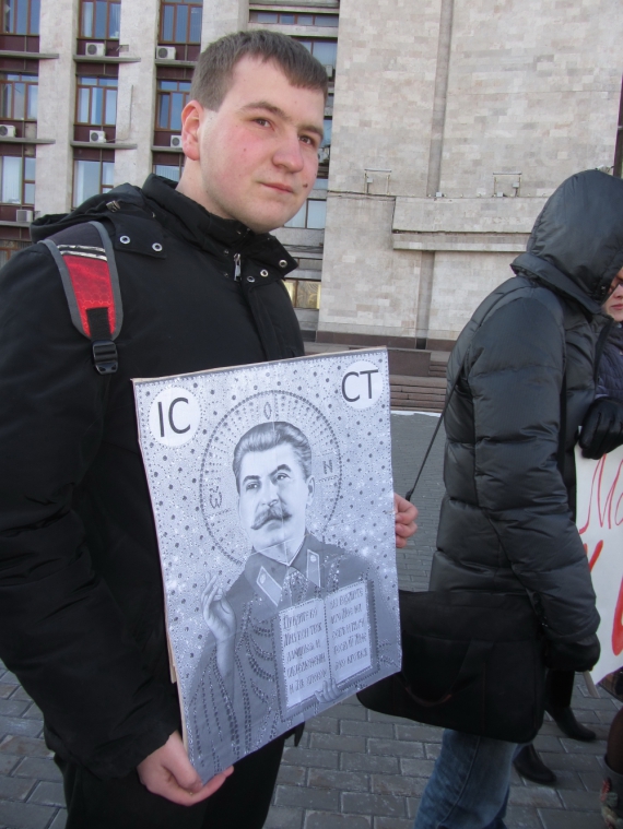 "Иосиф Виссарионович утверждал на земле самую справедливую власть, и поэтому мы требуем, чтобы эти иконы были в каждом храме каждого города и села! Не только Украины и России, но и по всей земле, где только слышна русская речь! Ведь как мы знаем, Иосиф Виссарионович считал себя человеком русской культуры. И русский мир этому Великому вождю обязан своим существованием. Поэтому призываем вас канонизировать Иосифа Виссарионовича! Да здравствует Святой Сталин!" – заявил организатор акции донецкий блогер Денис Казанский.