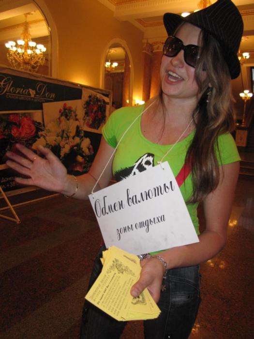 Вчера в Донецком национальном академическом музыкально-драматическом театре состоялась премьера нового мюзикла "Шоу продолжается". Перед началом спектакля, одетые в пляжные костюмы, артисты изображали в фойе происходящее на курортной набережной. Торговали валютой (в виде своеобразных денежных знаков зоны отдыха под названием "один хит"), зазывали сделать фото в театральном костюме, заказать песню у барда, нарисовать шарж и спеть караоке. Актер в костюме советского милиционера брал взятки у пляжных бизнесменов.