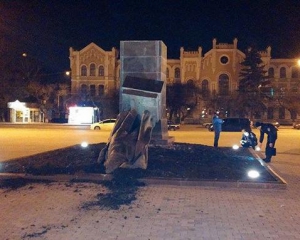 По информации "ВВС Украина", около десяти человек в балаклавах цепляли на шею монументам железный трос и сбрасывали их с постаментов при помощи белого микроавтобуса.