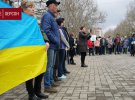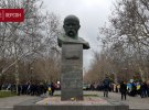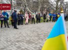 Люди пришли к памятнику Тарасу Шевченко с украинской символикой и плакатами "Херсон - это Украина!"