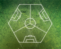 Поле для игры в трёхсторонний футбол имеет форму равностороннего шестиугольника с длиной каждой стороны 30 метров. Трое ворот расположены на каждой второй грани шестиугольника.