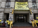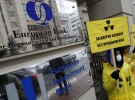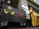 Европейские активисты Greenpeace вышли с плакатами, чтобы призвать Европейский банк реконструкции и развития (ЕБРР) отказаться от финансирования ядерной энергетики в Украине.