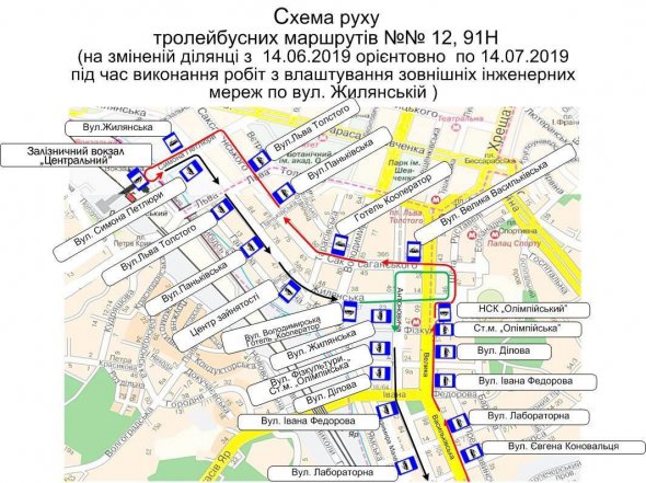 Соответственно движение троллейбусов в направлении станции метро "Лыбидская" будет организовано от железнодорожного вокзала "Центральный" до ул. Антоновича по действующей трассе, далее – ул. Жилянская – ул. Шота Руставели – ул. Саксаганского – ул. Антоновича, далее - по действующим трассам.