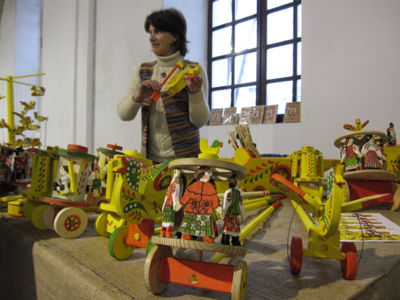 На одной из палаток показывают деревянные игрушки из львовского города Яворов - животных, птиц, кареты, машины и самолеты. Все они расписаны "Вербовка" - ярким узором, напоминающим веточку вербы.