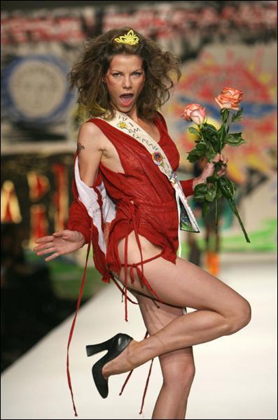 Модели демонстрируют одежду из коллекции британского дизайнера Вивьен Вествуд. Ее коллекцию назвали одной из самых ярких среди всех представленных в Лондоне, Милане и Париже. Она предложила модницам образ попугая - чем больше одежды, тем лучше.