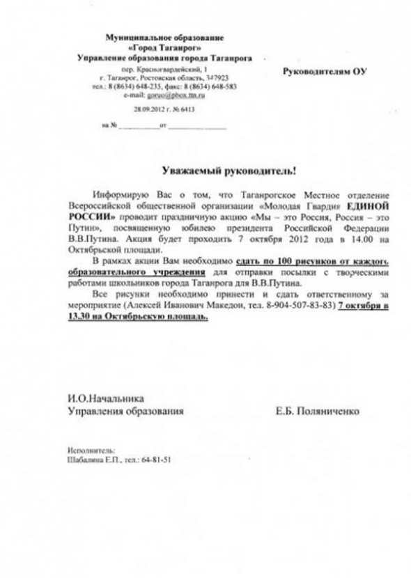 Управление образования города Таганрога Ростовской области разослало в школы города распоряжения сдать к юбилею Путина по 100 рисунков с изображением президента от каждого образовательного учреждения.