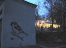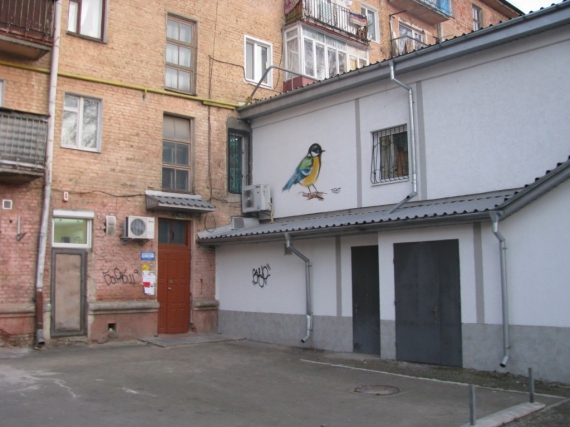 Неизвестный художник нарисовал на уровне второго этажа одного из домов на площади Независимости, синичку на веточке. Ее размер - более метра. На кирпичном здании трансформаторной будки в городском парке Тараса Шевченко изобразил большого воробья.
