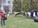 Двое мужчин натягивают между деревьями веревку, - так, чтобы было видно из кабинетов чиновников. На ней развешивают простыни, носки, рубашки и брюки. Рядом стоит картонная коробка с надписью-адресом: "КМУ Азарову"