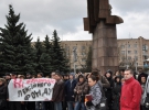 К 9 утра на площади у Пенсионного фонда уже собирается толпа. Некоторые из предпринимателей не пошли торговать на рынок. Принесли с собой простыни с надписями "Долой Азаров от базаров", "Нет - произволу Пенсионного фонда", "Равные условия для малого и крупного бизнеса" - шквальный ветер выдирает их с рук.