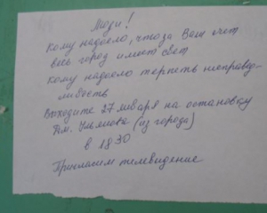 "Кому надоело, что за ваш счет весь город имеет свет, кому надоело терпеть несправедливость, выходите на митинг", – говорится в объявлениях, расклеенных, в частности, на подъездах жилых домов в Гагаринском районе Севастополя.