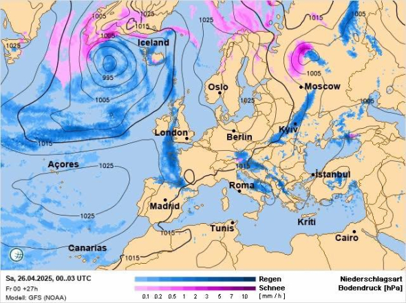 Дожди 27 апреля пройдут в Полтавской, Черкасской, Днепропетровской областях, в Кропивницком с районами, местами в южной части и вечером в восточных областях. На остальной территории Украины в воскресенье осадки маловероятны.