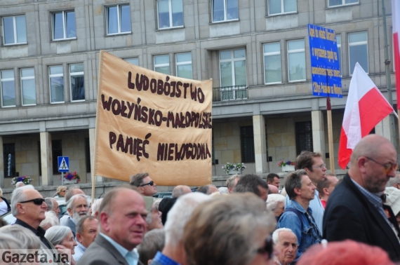 В 14.00 люди выстроились в колонну с огромным количеством транспарантов и плакатов: "Кто заработал на польской крови?", "Не о мести, а о памяти просят жертвы", "Тоталитаризм всегда ужасен: Катынь - 1940, Волынь - 1943, Смоленск - 2010 ", "Боже мой, а где моя гордость?", "Геноцид волынско-малопольский, память неудобная". В шествии приняло участие уже около 3 тысяч человек.