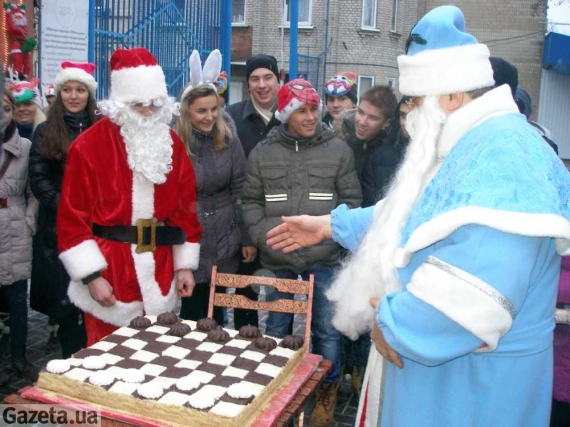 25 декабря в 15.30 в Виннице состоялся шашечной турнир между Дедом Морозом и Санта Клаусом. Шахматная доска была сделана из торта, а шашки - с зефира. По условиям конкурса фигуры съедались игроками, а шахматную доску должен был съесть проигравший партию.