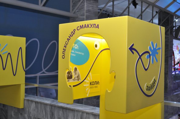 - Почти никто не угадывает. Ведь у людей, в отличие от животных, уши не возвращаются, поэтому очень сложно определить источник звука, - говорит Мария. Подводит к желтым коробок с отверстиями для головы. На каждом написано имя и фамилия украинских ученых. Есть Иван Пулюй, Даниил Заболотный, Александр Смакула, Валентина Радзимовська. Люди засовывают туда головы и слушают аудиозапись о деятельности ученых.