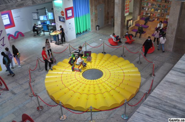 Перед рецепцией музея работает голограмма президента Владимира Зеленского. Напротив - большие "стулья катушки". На них качаются ребята дошкольного возраста.