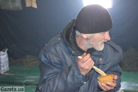 Марина сидит на скамейке с калекой-попрошайкой 53-летним Владимиром Петушком. На одной из двух "буржуек", что отапливает палатку, большая сковорода, в ней варят суп. Двое бездомных нарезают маленькими кусочками сало. Стол-парта, что при входе, заставлена ??продуктами. Пачками лежат "Мивина", лапша, чай, несколько буханок хлеба.