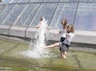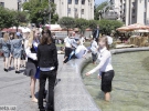 Три девушки сбрасывают босоножки и заскакивают в фонтан. Воды по колено. Одна толкает другую. Но не удерживается на ногах и падает в воду. Когда встает, громко ругается и матерится.