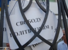 На металлическом ограждении возле суда висели таблички "Нет политическим репрессиям" и "Свободу политзаключенным". Также на ней повесили несколько плакатов с фотографиями задержанных. Флаги с символикой "Свободы" прикрепили к металлическому столбу фонаря.