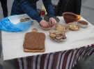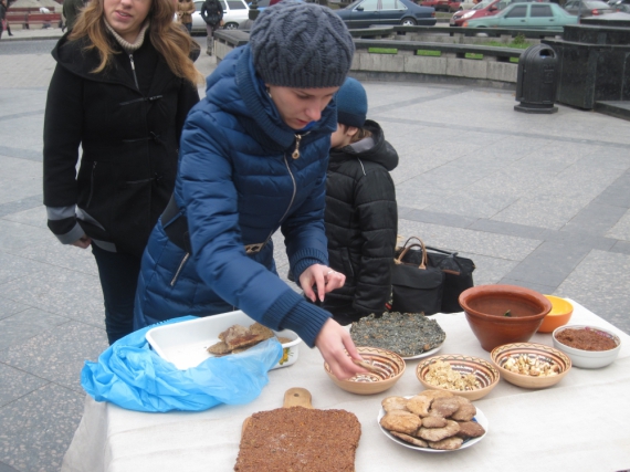 Организаторы на столе разложили миски с лепешками, паляницами. Прохожие издали осматривают блюда, слушают рассказы о них и акции, попробовать не решаются. Всем раздают листовки с приглашением прийти 24 ноября в 15.00 к памятнику Тарасу Шевченко, чтобы почтить жертв Голодомора.