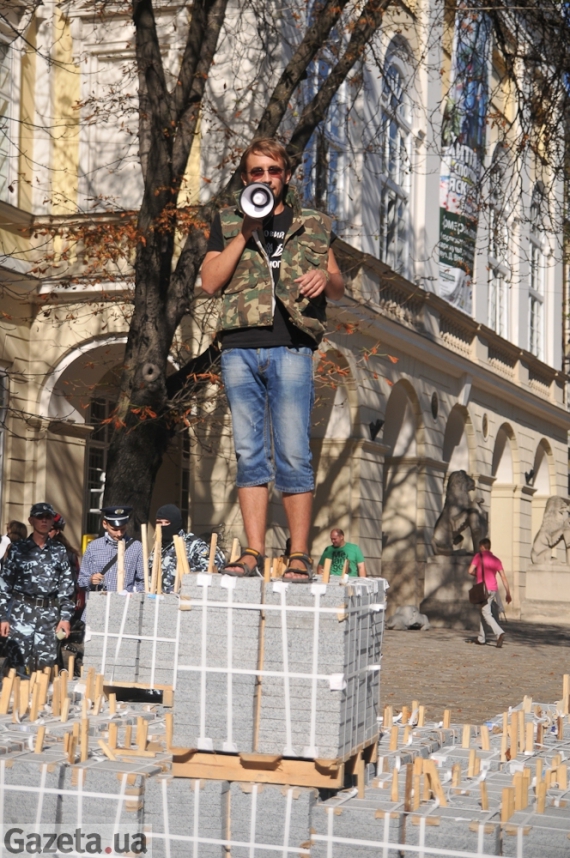 Перед собравшимися организаторы создали несколько бытовых ситуаций которые, по их словам, ставатимуться после принятия закона. Сначала переодетые в "беркутовский" форму ребята задерживали протестующих в камуфляже. После задержания раздевали их и отрывали пуговицы с трезубцем. Такая же ситуация была и со строителями, работавших в камуфляжной одежде. Импровизированных туристов "беркутовцы" ловили в сети. "Рыбаки" вышли к людям в смокингах и валенках.