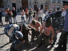 Наконец акции много молодых людей сняли свою камуфляжную одежду. "Беркутовцы" заставили всех стоять на коленях перед ним.