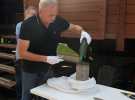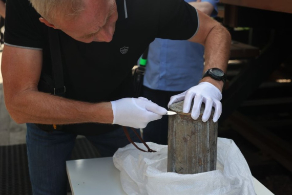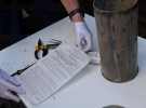 Сегодня в музее "Территория террора" специалисты открыли эту металлическую емкость. Внутри была стеклянная бутылка, а в ней - наградной лист военного летчика, героя советского союза Михаила Лиховида. Информация о боевом пути погибшего размещена на трех листах.
