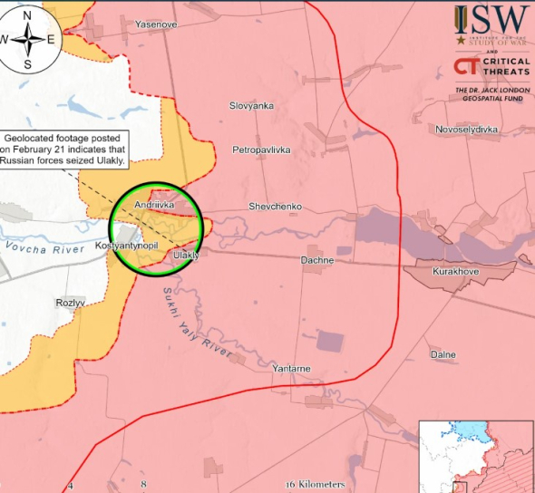 Аналитики института также фиксируют возобновление наступления захватчиков в районе Большой Новоселки (Новопавловское направление) после оккупации поселка в конце января этого года и временного приостановления наступлений в этом районе на несколько недель. Геолокационные кадры, опубликованные 20 февраля, указывают на то, что российские войска захватили Новоочеретоватое после недавнего форсирования реки Мокрые Ялы.