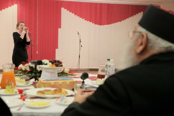 "Слава Иисусу", - приветствуют посетителей. На каждом столике стоит по три блюда. На одном 12 пирожков с вишней, яблоком и капустой. На другом 12 шоколадных, фруктовых и бисквитных пирожных. На третьем виноград "дамские пальчики", большой красный "кардинал", очищенные мандарины и порезанные бананы. Из напитков узвар и апельсиновый сок в стеклянных графинах. Каждому гостю на его тарелку положили трюфель, к которому прицеплено маленькое фото Гузара и цитаты из Библии.