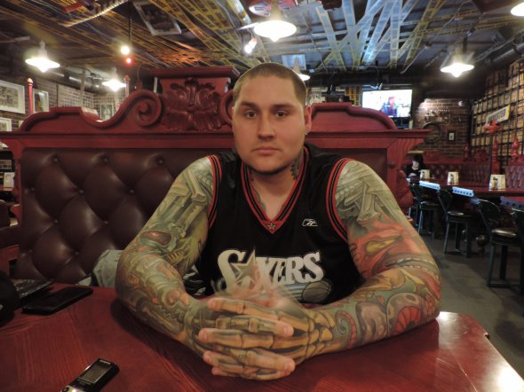"Спортзал постоянно работаю с железом. Поэтому первое тату сделал в стиле биометалика – на груди и плечах набил металлические трубы, будто проступают из-под кожи. Хотел показать свой сильный дух, несокрушимость и открытость. Мне тогда было 19. Работал, получал 600 гривен стипендии. За тату отдал 6 тысяч".