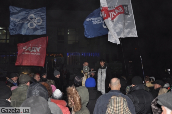 Анонсированное мероприятие начинается у 18.20. На площади собралось около сотни человек. Несколько человек держат флаги "Батькивщины", УДАР и Демальянса, раздают политические газеты и календари с Юлией Тимошенко и Арсением Яценюком. По периметру площади дежурит несколько десятков сотрудников милиции. Митинг начинают с молитвы.