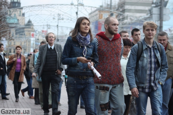 Все потянулись по Крещатику в сторону Майдана Незалежности. Впереди фото- и видеооператоры. Позади активисты с фотографиями и плакатами с изображением Георгия Гонгадзе.