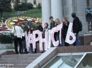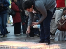 У Монумента Независимости уже зажженные свечи, из которых выложено слово "ГИЯ". На лестнице стоят молодые люди с символическими буквами, на которых написаны имена всех 62-х журналистов, погибших.